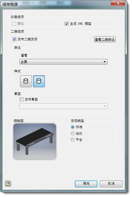 - 选中“发布二维资源”复选框可以发布资源的二维工程图(采用 DWG 格式)。发布三维资源的二维工程图可以创建二维资源以在 AutoCAD Factory 中使用。资源会自动放置在 AutoCAD Factory 资源浏览器的用户文件夹中。单击“查看二维表达”按钮来预览资源的二维版本。