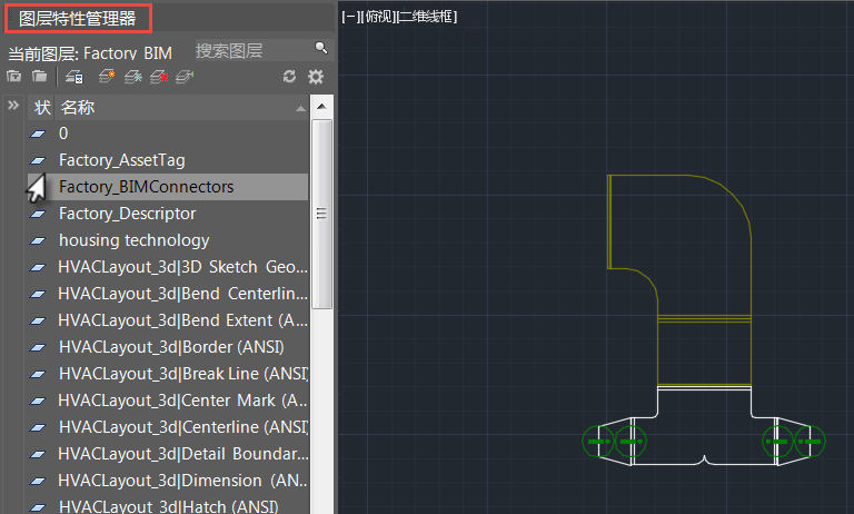 您还可以在“图层特性管理器”中查看 Factory BIM 接头,可以通过在命令行中输入 LAYER 访问该管理器。