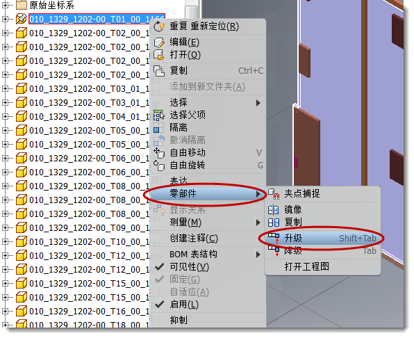 - 找到要转换为资源的项目。单击鼠标右键,选择“零部件”,然后选择“升级”。