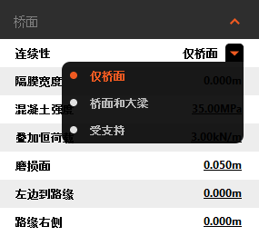 在“桥梁”资源卡的“桥面”部分可以选择连续性方法。默认情况下,桥梁连续性设置为“仅桥面”,这不是完全连续性设置。