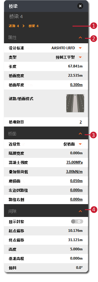 选择整个桥梁以查看和修改桥梁起点和终点桩号、桥梁类型、桥墩数量、桥墩的放置和桥面样式,调整间隙,更改设计标准并完成其他设计目标。