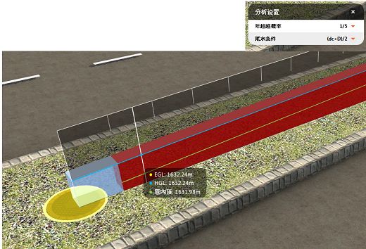 目测检查选定的管道段并检查其水力坡降线和能量坡降线的数据。识别过载管道和浸水检查井。调整 AEP 设置以模拟不同雨水级别条件下的模型性能。
