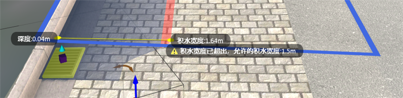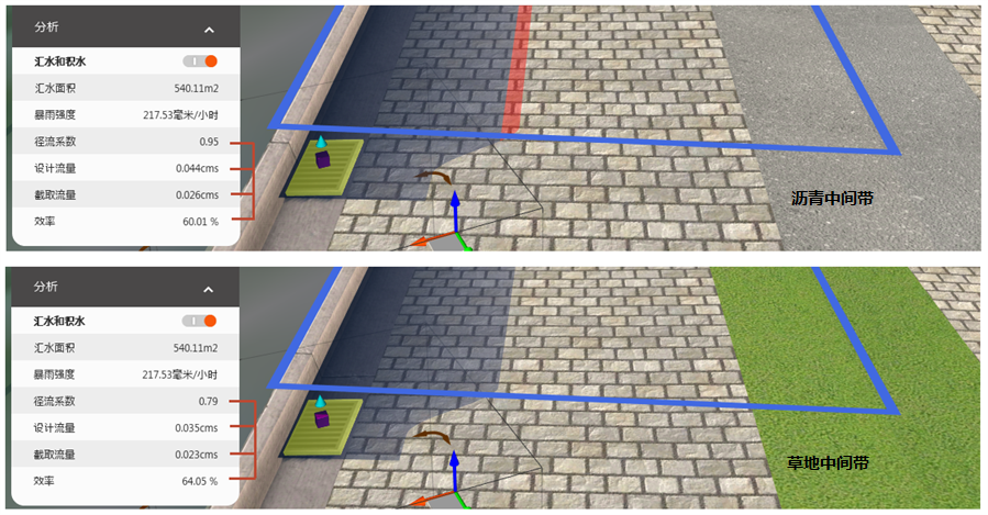 针对组件道路中使用的不同种类的材质,进水口分析将考虑径流系数的差异。在下面的对比中,资源卡上的分析数据显示了将有坡度的沥青中间带替换为草地中间带的效果,另外还显示了相同的入水口和条件。请注意,使用沥青的积水宽度值超出建议的允许积水宽度(红色区域)。在这种情况下,切换到草地中间带可修正这一状况。