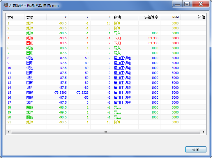 “查看刀具路径”对话框显示了有关各移动的信息,例如进给量和速度、移动类型、刀具补偿和移动坐标。