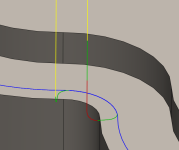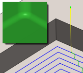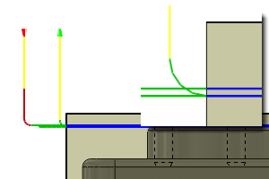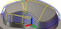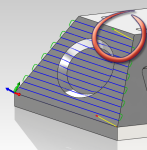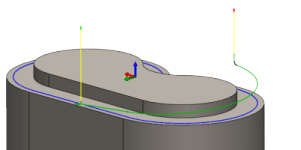 对于不完全水平的曲面,Inventor HSM Express 会在轴向和径向(壁)加工余量值之间插值,因此在这些曲面的轴向方向上剩余的毛坯量可能不同于指定的值,具体取决于曲面坡度和径向加工余量值。