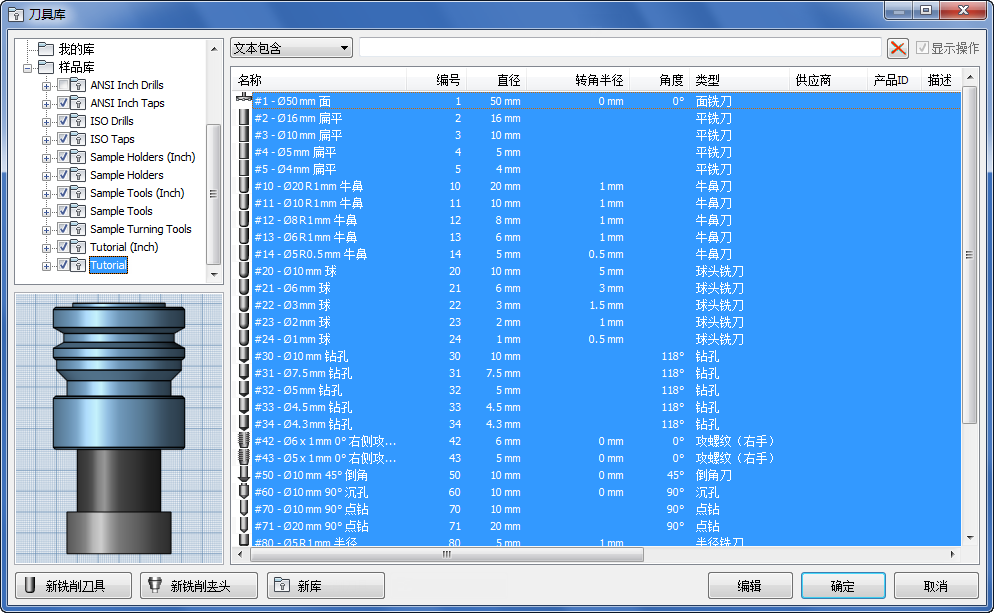 - 在“刀具库”对话框中,单击鼠标右键,然后选择“粘贴”,或者按 Ctrl+V 键。剪贴板中的刀具将添加到当前库中,但不会替换现有刀具。如果想要替换刀具,您需要先将其删除。