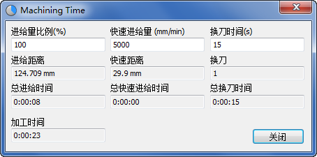 “加工时间”对话框显示有关总加工时间(由进给时间、快速进给时间和换刀时间之和确定)的信息。该值使用当前刀具的进给和速度数据、所计算刀具路径的长度以及换刀时间计算得到,这几项数据均可通过该对话框进行输入。