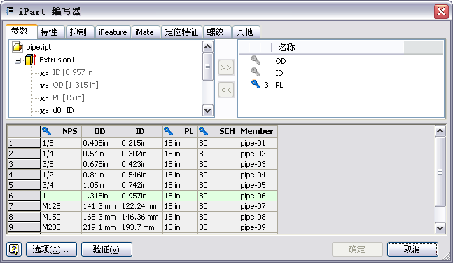 例如,打开样例管材 iPart“Autodesk\Inventor Professional <版本>\Tutorial Files\Tube & Pipe\Example_iparts\pipe.ipt”。在模型浏览器中,双击“表”以打开“iPart 编写器”对话框: