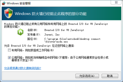 解决方案:在防火墙设置中删除“%ProgramFiles%/Autodesk/Desktop Connect/forever/node.exe”中的现有异常,然后重新启动 Inventor。系统显示提示时,在“Windows 安全警报”对话框中选择“允许访问”。