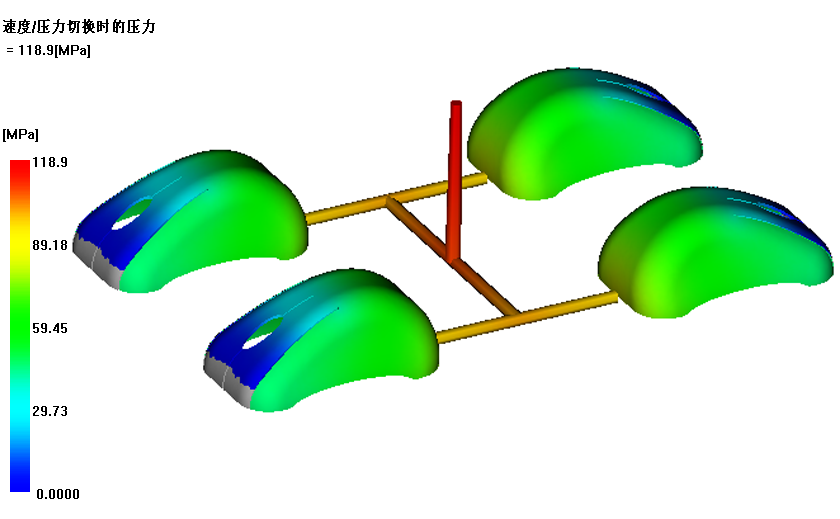 速度/压力切换时的压力最好低于注塑机容量的 75%。对于典型的容量为 140 MPa (~20,000 psi) 的注塑机,可接受的压力应低于 100 MPa (~14,500 psi)。