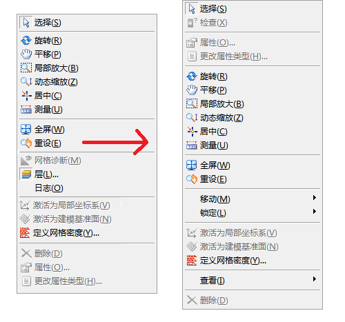 只需单击鼠标右键即可找到最常用的工具。下图左侧所示为旧鼠标右键菜单;右侧所示为此版本中该菜单的外观。所有模型操作工具仍位于上级,因此可以仅通过单击进行访问。