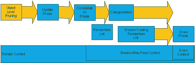 In the shadow map generation pipeline the render context would have a camera based on the light casting the shadow. The pass context would indicate rendering is occurring to create shadow maps. The categorization would prune out everything except “shadow casters” and discard all other render items.