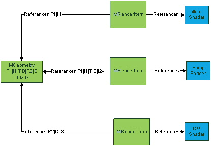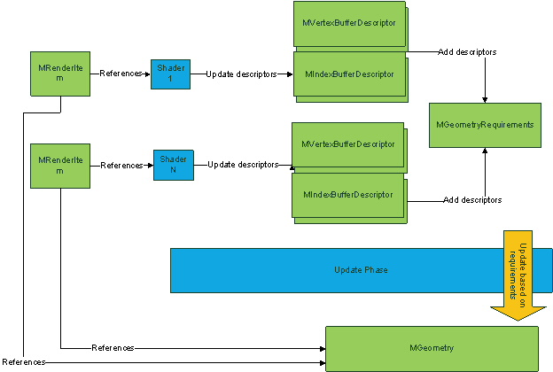 Figure 22: In this example, a few render items are shown. The shader for each respective render item specifies a set of descriptors (index or data) and the descriptors are accumulated into a single MGeometryRequirements instance. When an update is required, those requirements are fulfilled and the resulting data cached and referenced by an MGeometry instance. In this particular case, all render items reference this MGeometry instance, and use this data during the rendering phase.