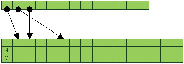 Figure 18: Each item in the index list defines a data offset into a position (P), normal (N) and color (C) vertex buffer. Three indices are used per triangle.