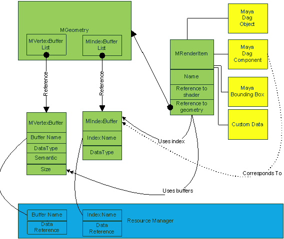 Figure 21: The MRenderItem references an MGeometry instance. The MGeometry instance references one or more MVertexBuffer instances, and zero or more MIndexBuffer instances. The MRenderItem keeps information about the specific MVertexBuffers and MIndexBuffer it uses. Any Maya DAG component can correspond to a specific MIndexBuffer. The data for MVertexBuffer and MIndexBuffer is managed by the internal resource manager which interacts directly with the GPU data.