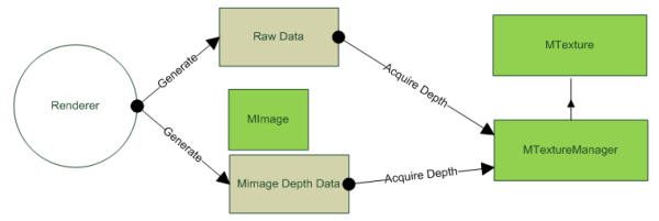 Figure 31: The possible data paths for creating depth textures is shown. The data can be created by a given renderer or by hand. The interfaces to MTextureManager allows for input via raw data or via MImage argument.