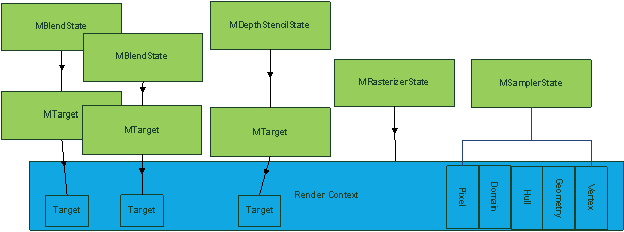 The following diagram shows the logical connections between state and the overall rendering context. Blending is a property of a color target; depth and stencil state is a property of a depth+stencil target stage; sampling is a prop­erty per shader stage; and rasterization is a render context property.