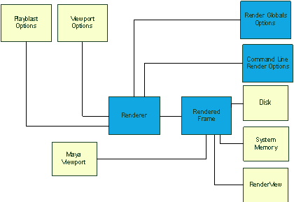 In the old system, only viewport based rendering was possible. In the current system, rendering to the RenderView window and command line (batch) rendering are also supported. For the latter, this also includes command line rendering via the playblast interface.