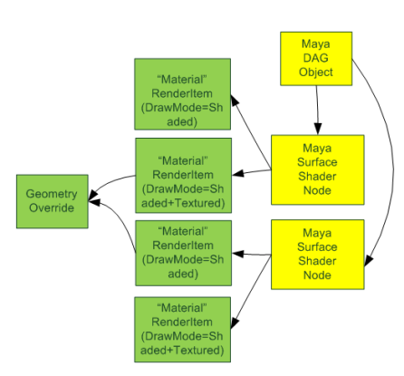 In this example, a DAG object has 2 shaders assigned to different components on the DAG object. It is possible to have 4 “material” render items: one for each component shader to draw in “shaded” draw mode, and one for each component shader to draw in “shaded and textured” mode.
