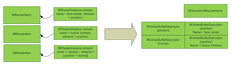 The figure above shows three render items on the left. The top-most item is for drawing face centers. It requires only positions and has a custom name of "face center". Next is an item to draw active vertices and requires positions and has a custom stream name of "Active Vertices". The last is a material render item which requires positions and normal. There are no custom names. When the final cumulative set of requirements comes back for which the override must provide geometry, there are descriptions for 4 streams of data required (MVertexBufferDescriptor): 3 position streams and one normal stream. The position streams could be shared for material and active vertex display.