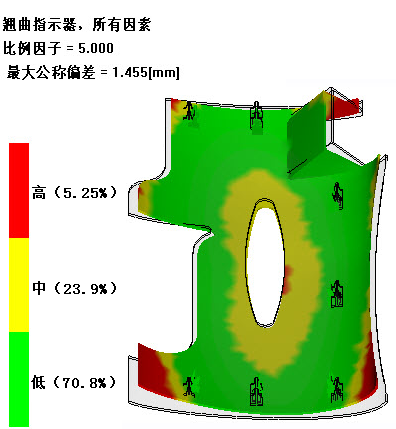 此结果显示了零件的翘曲(形状的平面改变)的相对大小。绿色区域小于最大公称偏差的 80%,红色区域则至少为该偏差的 120%120%。最大公称偏差的默认值为零件平均壁厚的一半。此结果显示在结果图例中,同时列在“翘曲约束”