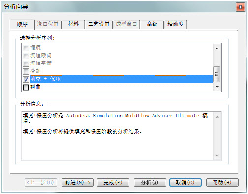 选中“填充 + 保压”作为分析序列,然后单击“下一步”。