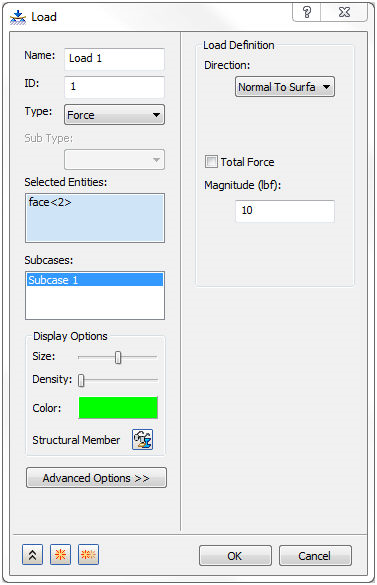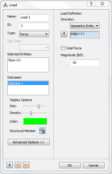与“约束”类似,可以拖放“载荷”,或单击鼠标右键并选择“子工况”-“编辑”,然后将其亮显以将其包含在“分析”中。