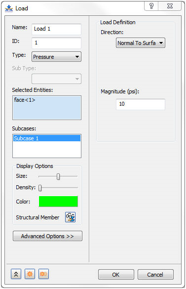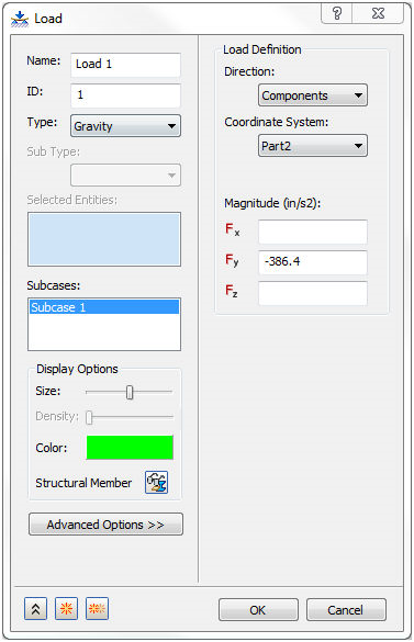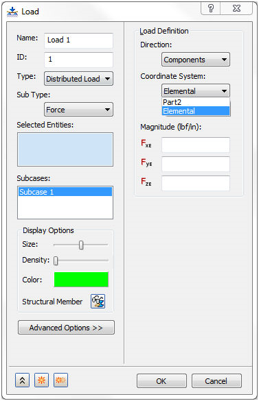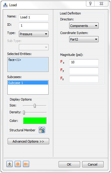 “载荷定义”部分取决于在“载荷”窗体上选择的“类型”。此部分包含三个子部分:“方向”、“坐标系”和“幅值”。以下示例说明了某些载荷类型。