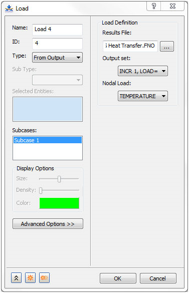 此浏览按钮允许加载结果文件 (*.FNO) 和使用当前加载的结果文件作为输入载荷。目前,“节点载荷”下拉列表仅支持温度输出。可以选择要从中获取节点数据的输出集以及要添加载荷的子工况。“从输出”载荷温度只能应用于结构分析。