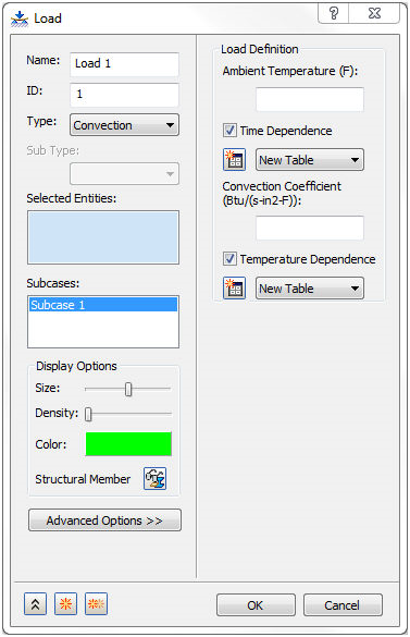 如果将分析类型设置为“非线性瞬态传热”,则环境温度可以与时间相关。如果将分析类型设置为“非线性稳态传热”,则对流系数只能与温度相关。