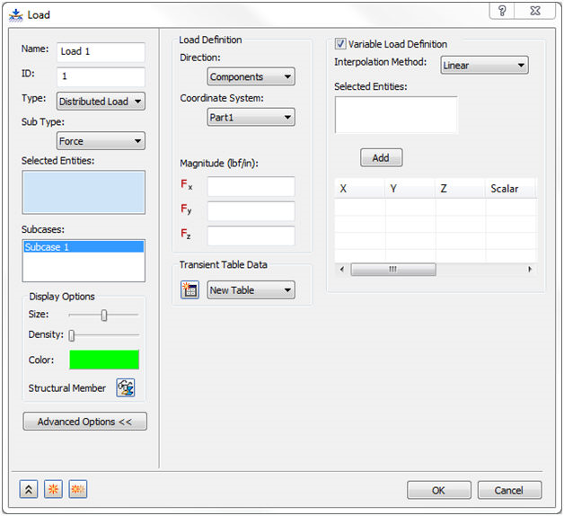 分布式载荷可以具有“子类型”,如“力”和“力矩”。它具有相对于“全局”或“单元”坐标的不同方向上的“幅值”选项。