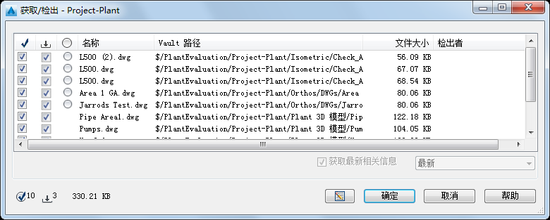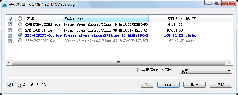新的“获取/检出”对话框还会显示 Vault 状态。上面的 str-building 将由其他用户检出。已向您检出 ppg-piping-01。str-rack-01 也可供检出。