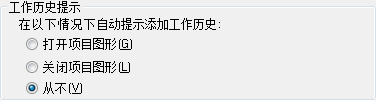 在“项目详细信息”窗格上的“工作历史提示”下,单击以下选项之一,以指定设计师必须在何时输入有关其图形的工作历史信息: