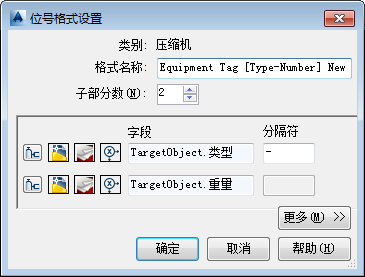 提示: 可根据需要使用任意多个特性作为子部分。分隔符只能用在这些子部分之间,而不能用在子部分内部。如果在“分隔符”框中放置分隔符,这些分隔符将显示在位号中各子部分之间。如果在“字段”框中的各项目间输入划线(例如 N-N-N),可能会产生意外的结果。