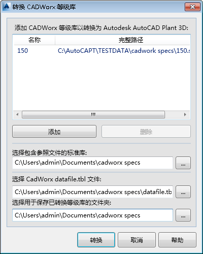 列出为进行转换而添加的 CADWorx 等级库或元件库。