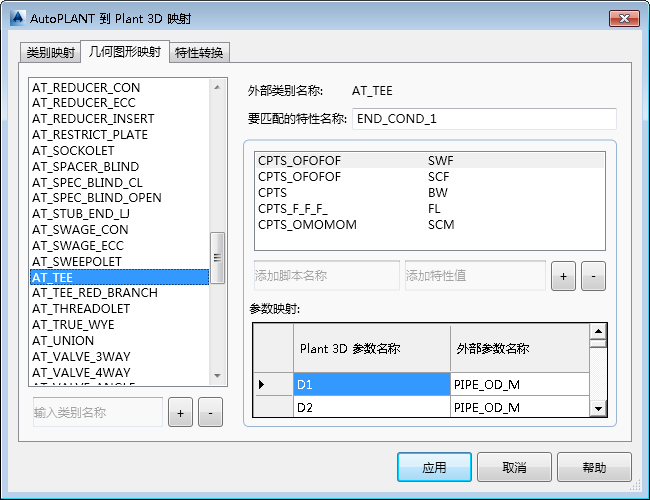 指定要在各种环境中匹配到 Plant 3D 端点类型图形脚本的 AutoPLANT 特性名称。在如图所示的对话框中。例如,转换映射说明为:如果 AutoPLANT END_COND_1 为 SWF,请使用 Plant 3D 脚本名称 CPTS_OFOFOF;如果为 BW,请使用 CPTS,依次类推。