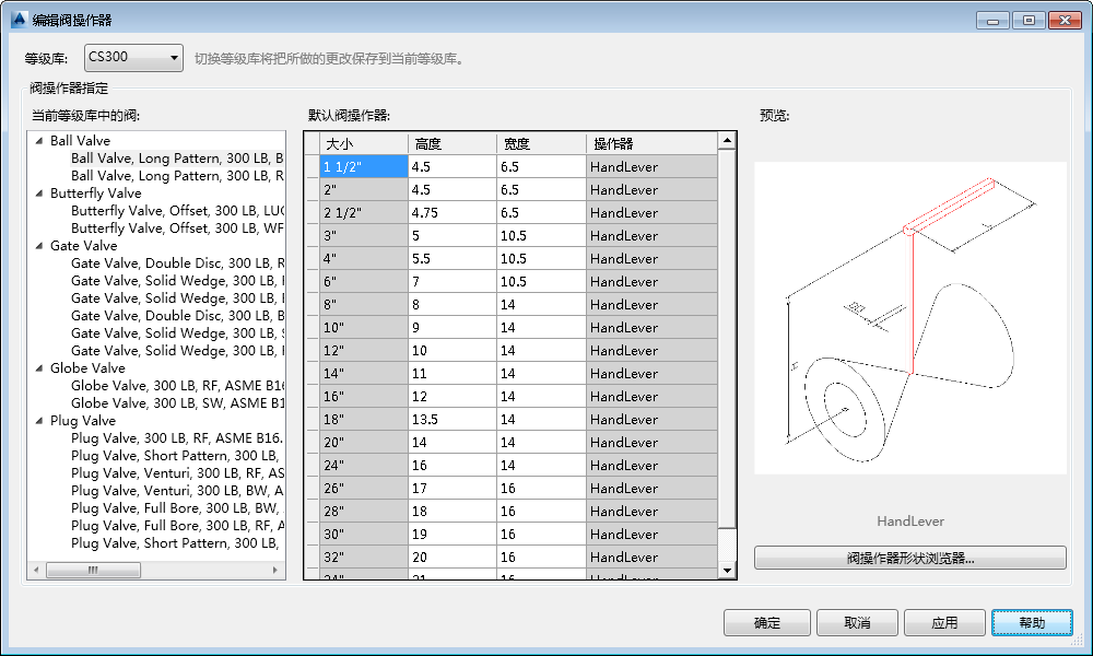 指定管道等级库中阀的默认操作器。