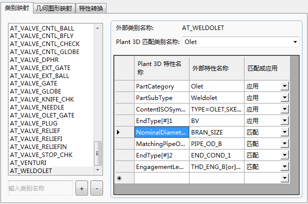 如果 AutoPLANT 或 CADWorx 类别有多个特性,而 Plant 3D 只有一个特性,可以使用 [OR] 运算符。例如,对于 Plant 3D 特性“接合长度”,(对于 AutoPLANT)可以指定 THE_ENG_M [OR] SKT_DPTH_M。EngagementLength 将映射到包含值的任一特性。