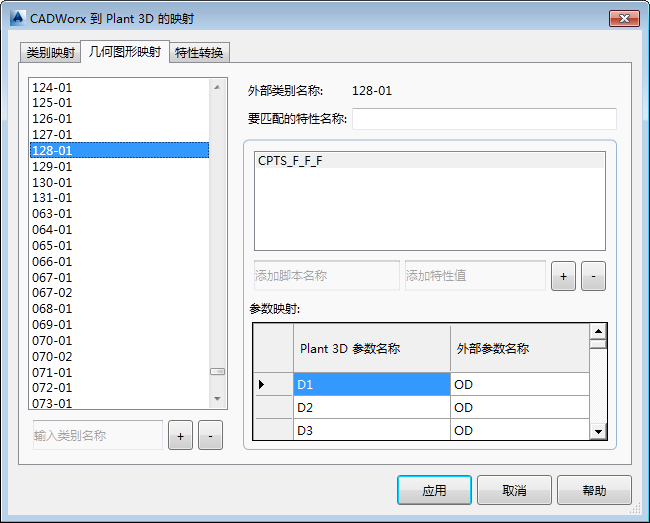 指定 Plant 3D 与 CADWorx 之间的参数映射。每个几何图形映射都有对应的参数集,且这些参数可以随形状而异。