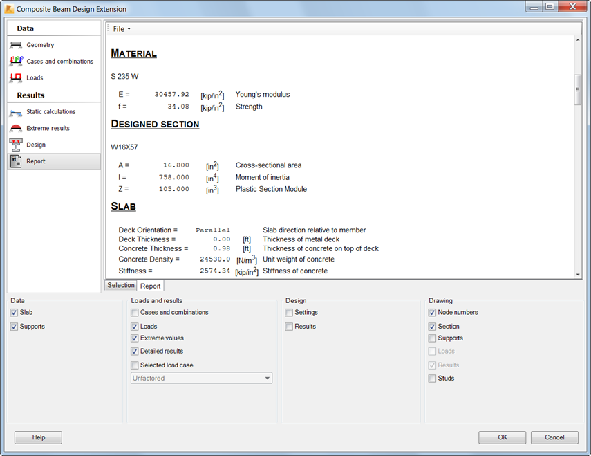 To view a report, select the Report tab in the graphic viewer. You can select the following data and results to be displayed in a calculation note: