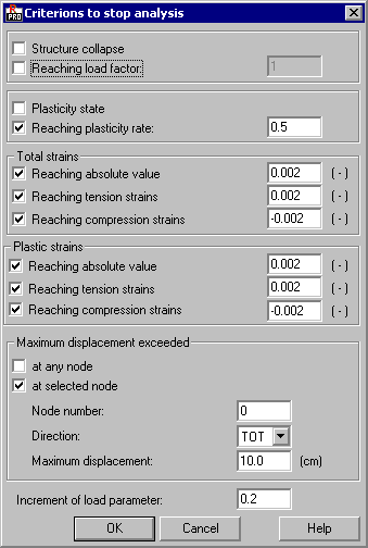 Analysis performs until the value of plastic strains (the absolute value of a strain value, the value of tension strains or compression strains) reaches a user defined value or until the divergence of the iterative process is obtained. The analysis stops if one of the conditions occurs.