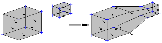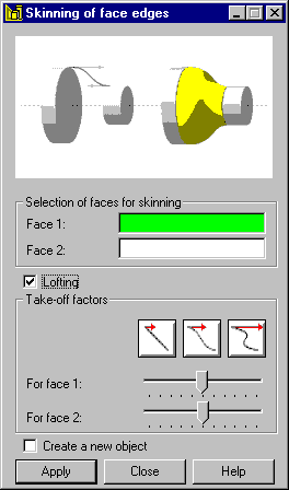 - If the Lofting option is selected, specify the values of the take-off factors for Face 1 and Face 2. The values of these factors affect the shape of a skinned surface: the greater the value of these factors, the smoother is the part describing the passage from the plane tangential to the faces to the plane of the skinned objects. The sliders let you select the values for the take-off factors for face 1 and face 2. There are 3 basic settings of the factor values: