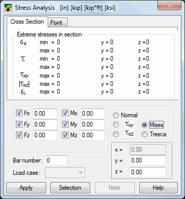 Select the Cross Section tab in the Stress Analysis dialog to display the extreme stresses obtained in the selected bar cross-section.
