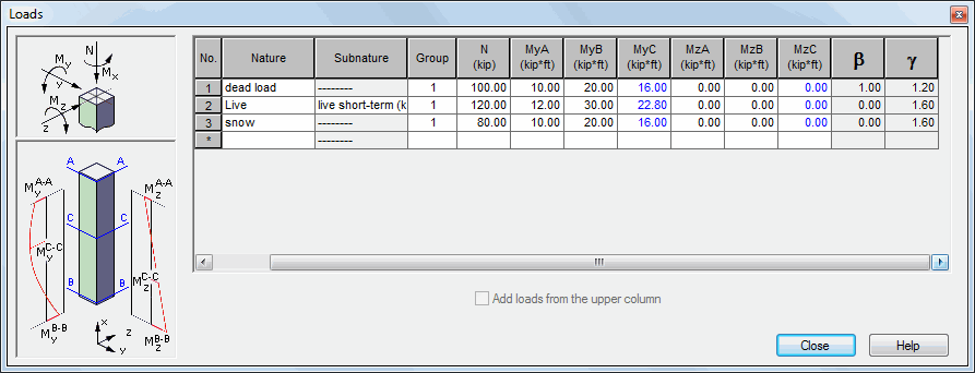 Column loads can be defined in the above dialog box. Depending on the calculation options selected, the user may define either only the compression force (the case of the column axial compression) or the compression force, moments (the case of the column compression and bending) and shear forces (the case with shear considered). It is also possible to automatically add upper loads. If the option Add upper loads is selected (√ appears on the screen) loads from the upper column are added to the loads of the current column. Added loads are saved in the first rows of the column load worksheet and cannot be edited. When the option is deselected, upper column loads are skipped during column design process.