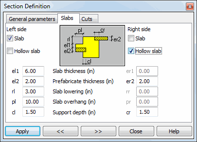 - prefabricate thickness (thickness of the prefabricated slab supported by an RC section) on the left and the right side - the options: Slab and Hollow slab are mutually exclusive
