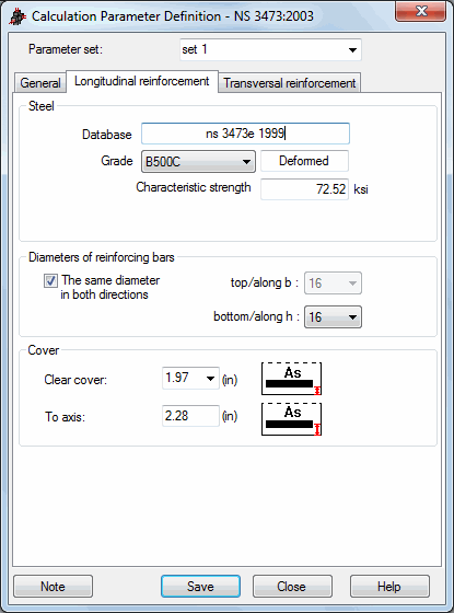 The Longitudinal reinforcement tab of the Calculation Parameter Definition dialog box for the Norwegian code NS 3473:
