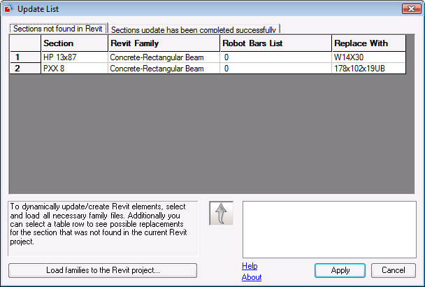 - 在将结构模型从 Autodesk CBS 传输到 Autodesk® Revit® 的过程中,如果并非所有必要的族类型都加载,则可以使用“更新列表”对话框添加截面。