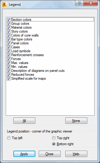 - Colors of sections, groups, materials, stories, bar types, and panels - When selected, Robot presents a list of colors assigned to the elements being displayed, such as sections, materials, stories, bars, and panels.
