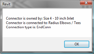 The following dialog box is the result of running this code example on the connector from a piece of mechanical equipment.
