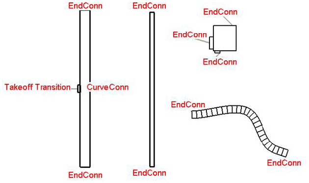 To traverse a system, you can examine connectors on the base equipment of the system and determine what is attached to the connector by checking the IsConnected property and then the AllRefs property. When looking for a physical connection, it is important to check the ConnectionType of the connector. There are both physical and logical connectors in Revit, but only the physical connectors are visible in the application. The following imagine shows the two types of physical connectors - end connections and curve connectors.
